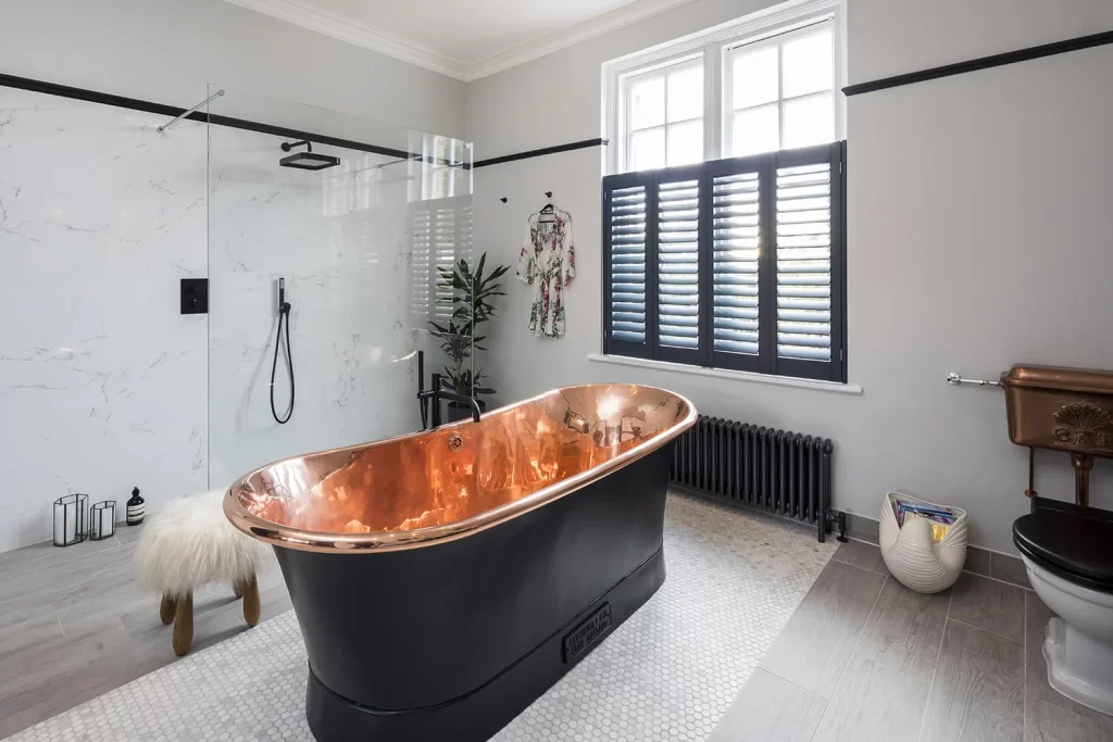 Bathtub dengan aksen tembaga mampu memberikan tampilan elegan dan mewah pada area kamar mandi Anda. Anda dapat menambahkan aksen tembaga pada rangka bak mandi, keran, dan aksesori lainnya.